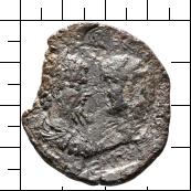 [Legende nicht erhalten]. Drapierte Panzerbüste des Septimius Severus mit Lorbeerkranz in der Rückenansicht nach r., gegenüber drapierte Büste der Iulia Domna nach l. Oben Gegenstempel mit behelmtem Athenakopf nach r. Unten Gegenstempel ΘEOY. |