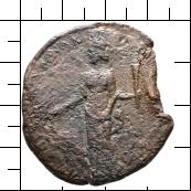 [Legendenrest]. Hekate mit Schale (phiale), Fackel und aufblickendem Hund stehend nach l. Umlaufend Beamtenname EΠI ΠPV TOV ΛEON AΛ[...] [rundes E]. |