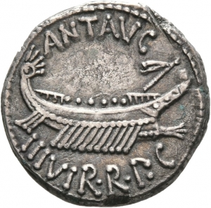 Vorderseite: ANT AVG / III VIR R P C. Kriegsschiff (Galeere) nach r. Hinter dem Schiffsbug ein mit Bändern geschmückter Dolonmast.